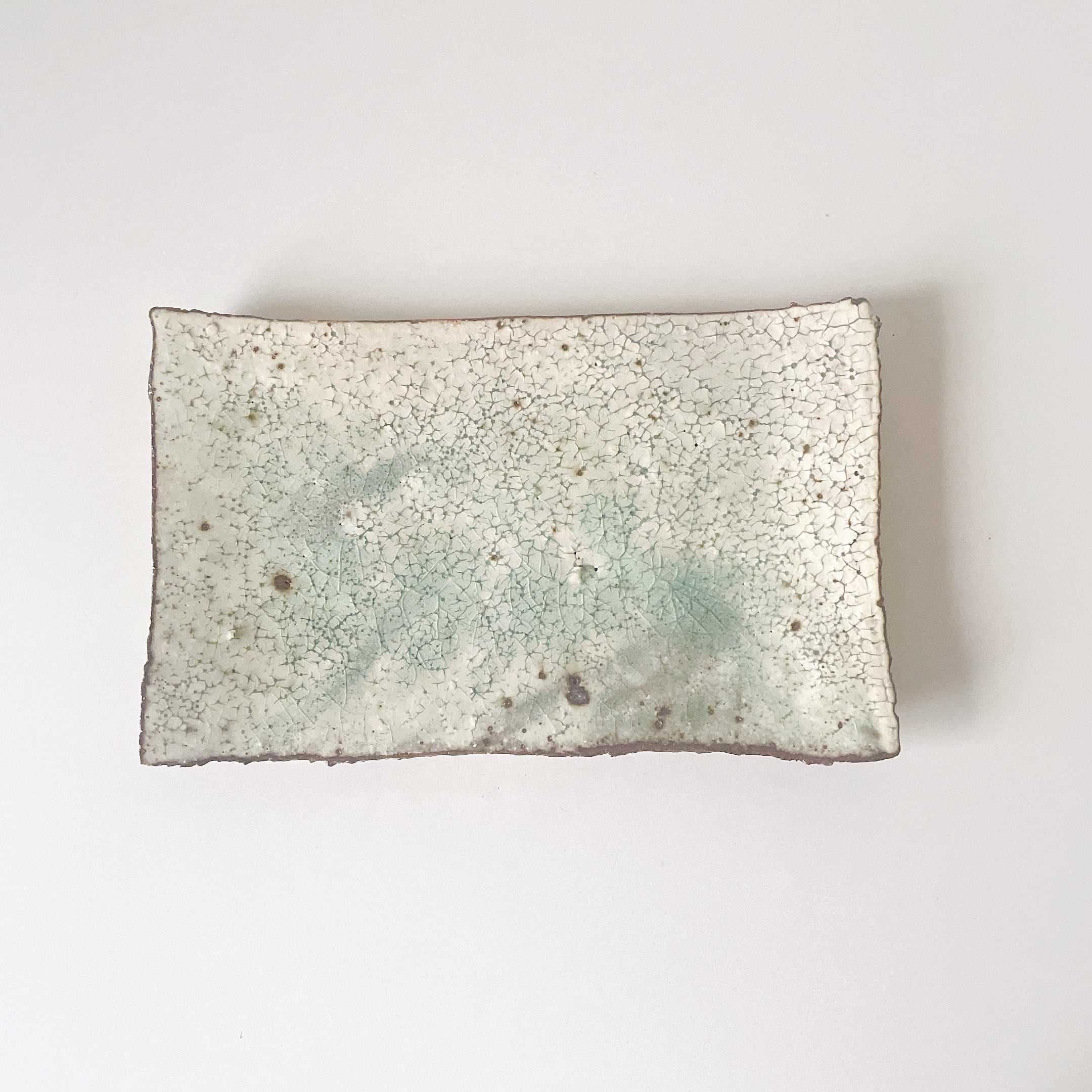 ありそうでない、希少な形の板皿。何ものせても様になり、ご家庭でもいつもとは違う洗練された食卓になります。グリーンのりんご灰釉の色ムラが特徴的で、長く使えば経年変化を楽しめます。ぜひ育ててください。