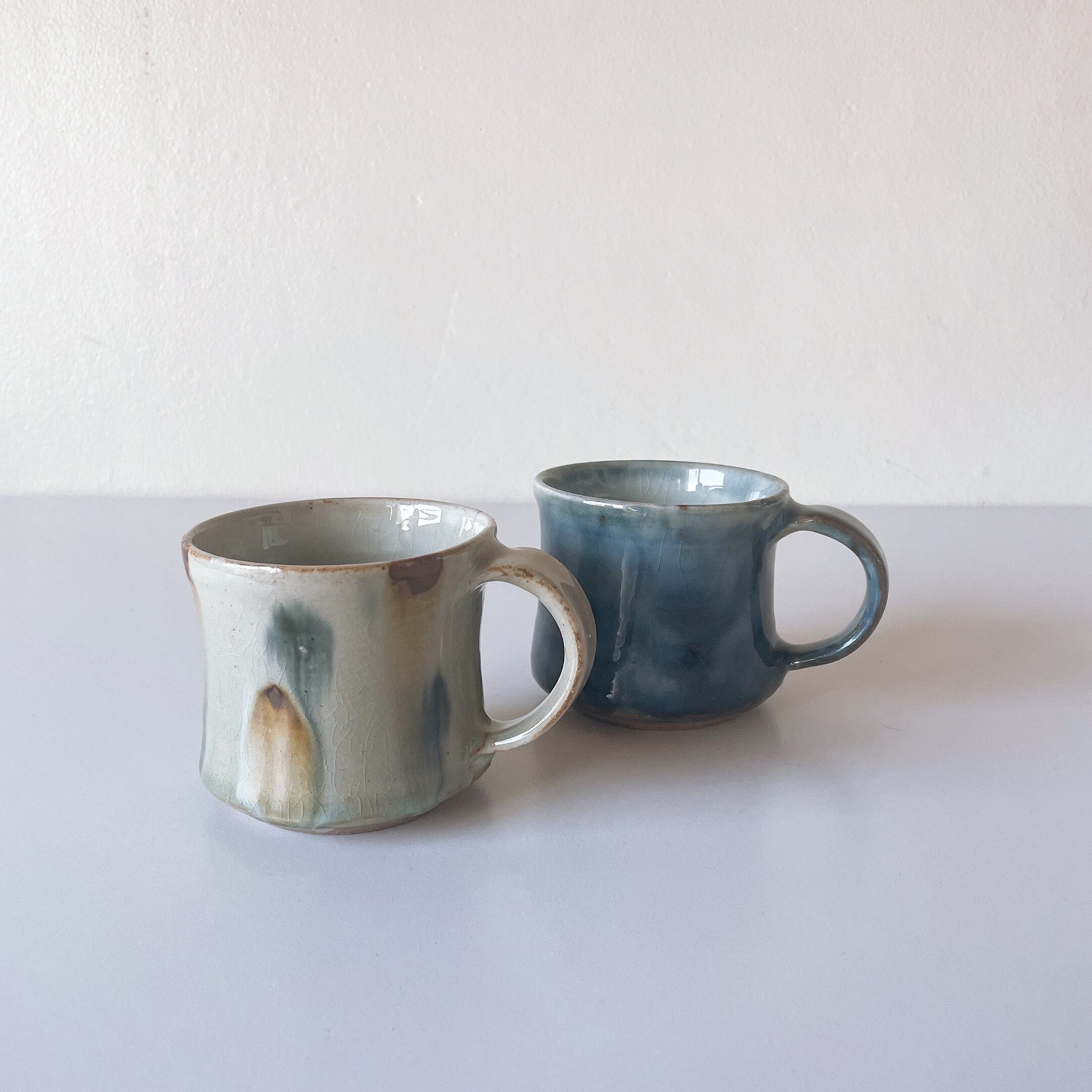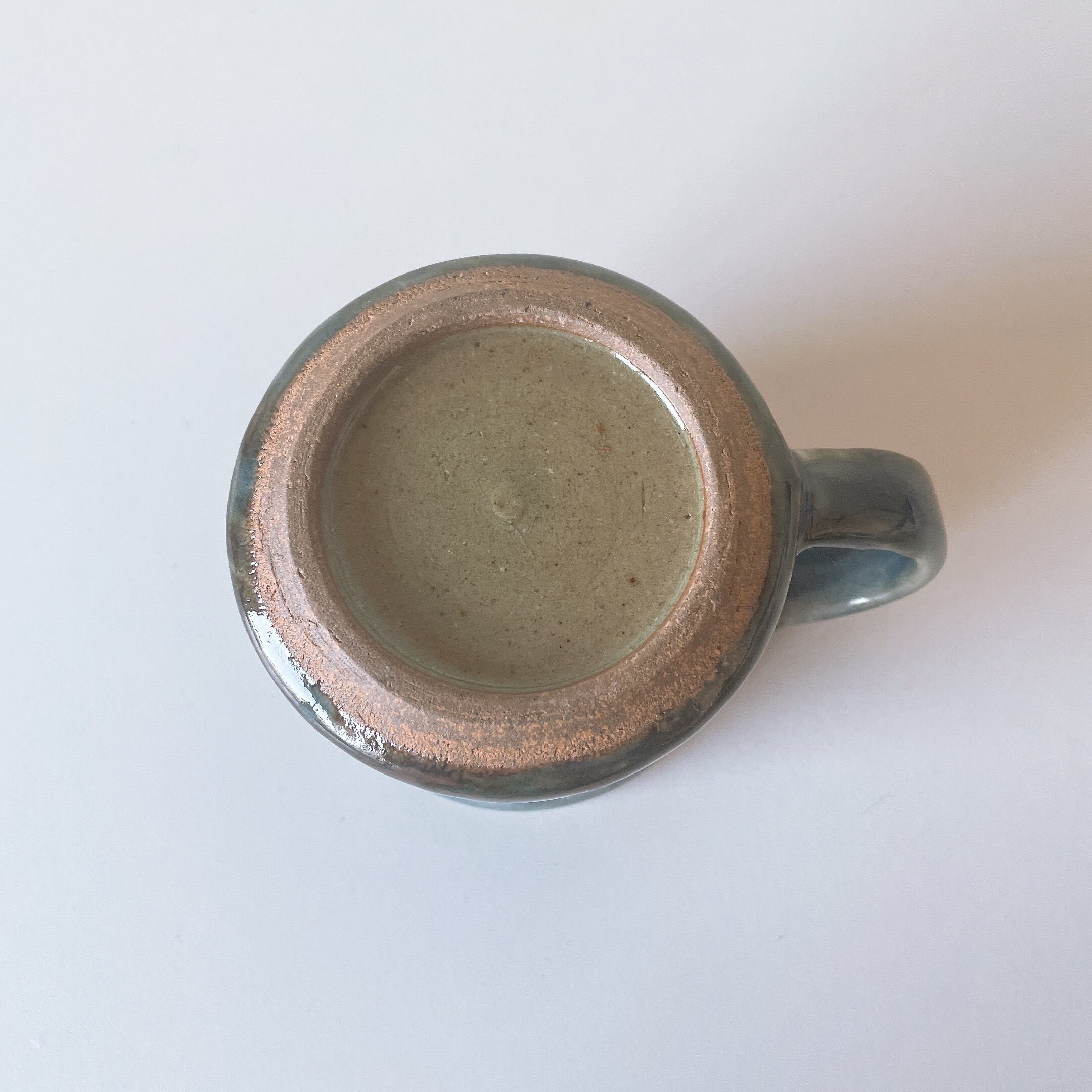 青い色むらが美しいマグカップ。取手の部分が大きく、個人差はありますが、指が3本入るので持ちやすく、沿った台形型が手にフィットしやすいです。